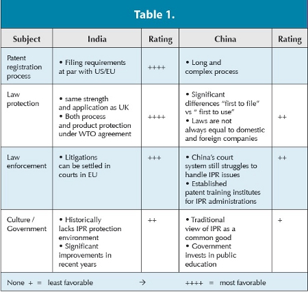 Overall there is no doubt that India has a more mature legal system for IPR protection than China. However significant practical issues still exist in both countries. While the risk for legal aspects such as patent registration process, patent law coverage/protection and information disclosure requirements by customs/ government in India is considered low, this risk is higher in China.