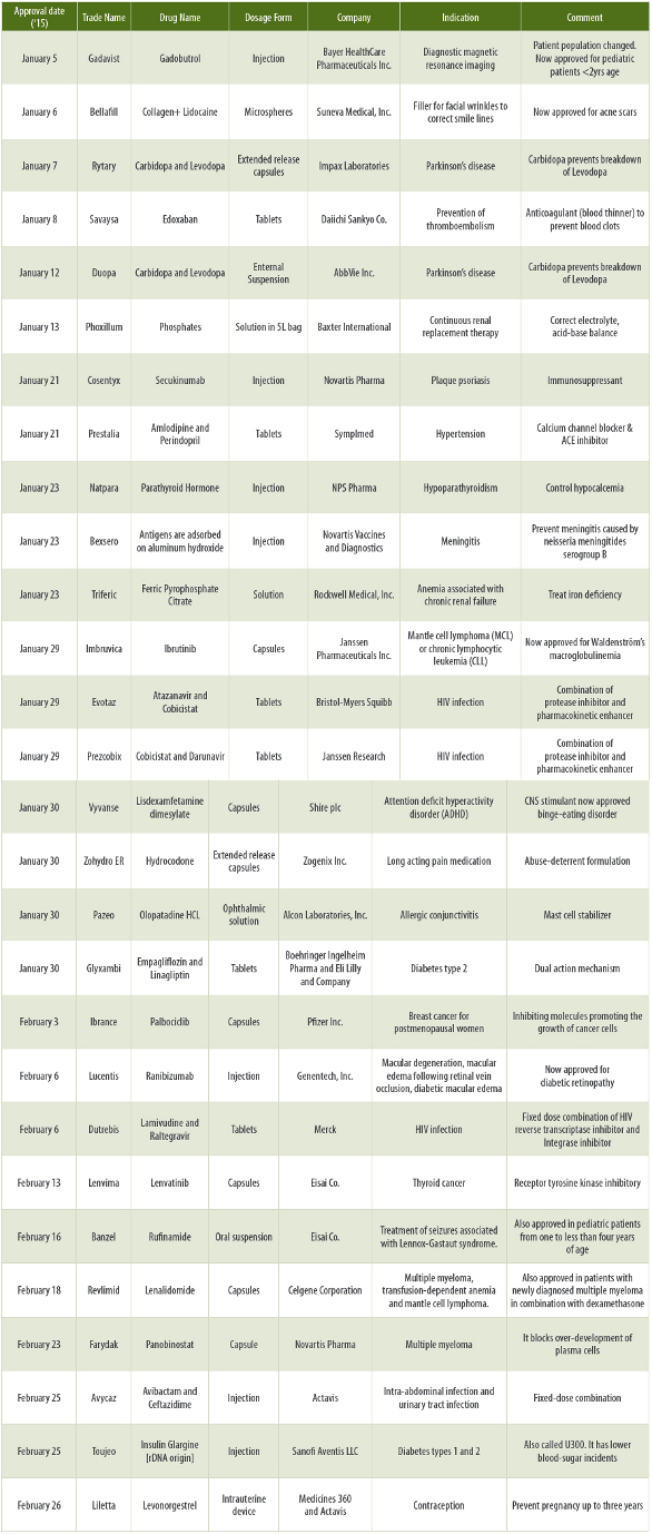 This column summarizes New Drug Applications (NDAs) approved in January-February 2015. In these two months, FDA approved 28 NDA’s.