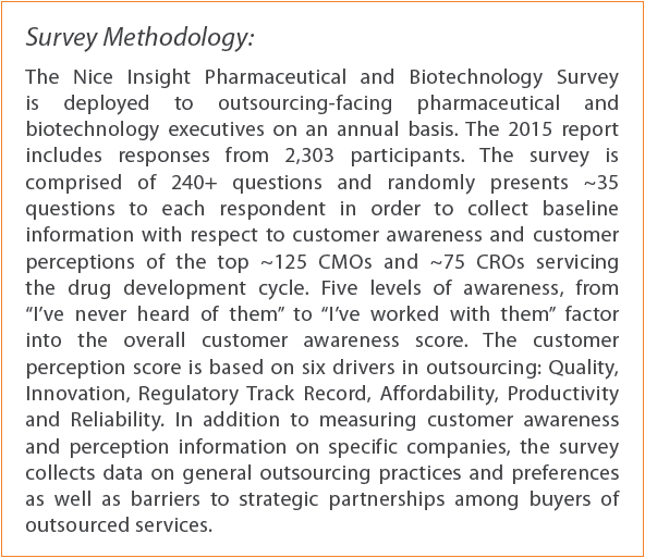 Outsourcing practices today have evolved into more of a partnership arrangement, where CROs and CMOs are engaged, in part, for their external knowledge and technical expertise. When Nice Insight asked survey respondents to consider a dozen different quantifiable traits for choosing an outsource company in a 2014 survey, 74% of survey respondents whose business was involved in developing biologics said technical expertise was very important when selecting an outsource partner, second only to 75% who chose "having a track record of success."5 Both qualities drive CMO and CRO engagement when it comes to biologics.
