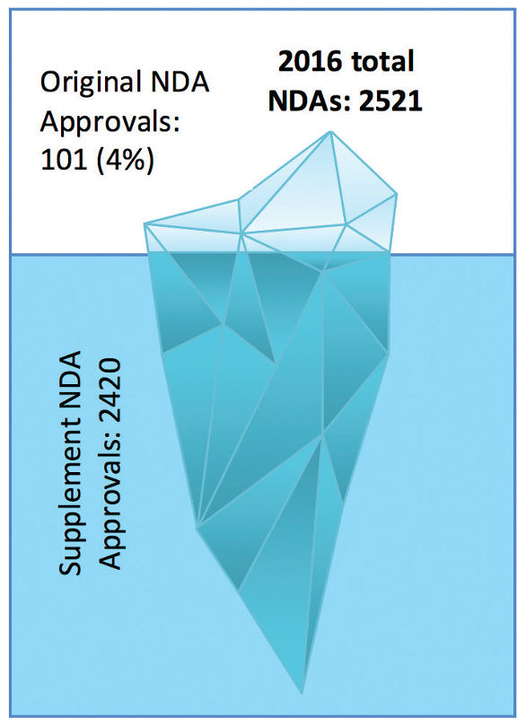 We usually cover all original NDA approvals and some of the supplements in Horizon Lines. Original NDAs are for those molecules which have been introduced in the market for the first time. The scenario in 2016 is like an “iceberg” with only 4% original NDA approvals compared to 96% for the supplemental NDAs as depicted in Figure 1. Most of the supplemental NDA approvals are for labeling (1202) and manufacturing changes (1015).