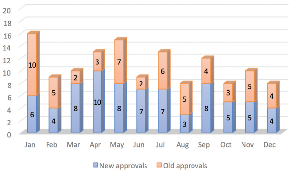Figure 2. A month-wise comparison of approvals for old and new drug molecules in 2016NDA types