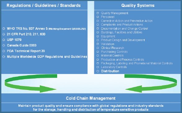 The objective of the cold chain management processes (quality system) is to establish processes to maintain product quality and ensure compliance with global regulations and industry standards for the storage, handling and distribution of temperature-sensitive products. The cold chain management processes may be established with the starting point of Good Manufacturing Practices (GMPs) and Good Distribution Practices (GDPs). GMPs are not new, as they have been in effect for many years and are generally well understood. However, GDPs, while an extension of GMPs into the supply chain, are relatively new to manufacturers and especially to supply chain partners. A manufacturer’s control over the distribution network is much less than within manufacturing but manufacturers should establish quality and operational systems/processes (internally and with supply chain partners) to maintain product quality, safety and efficacy during distribution. These quality and operational systems/processes should include cold chain management, as well as import/export compliance and distribution control management (see Figure 3).