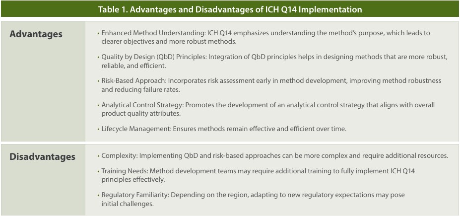 Supporting the lifecycle approach is the continuous monitoring of analytical methods, ensuring they remain fit for purpose over time. As stated previously, this continuous oversight can be resource-intensive and may require the development of new internal processes and documentation systems to ensure compliance. The nature of method lifecycle management involves periodic reviews, assessing the need for improvements, and implementing changes based on scientific rationale and risk assessment. The challenge lies in balancing the need for rigorous lifecycle management with the operational realities of method development and routine analysis. Table 1 shows the typical advantages and disadvantages of ICH Q14 implementation.